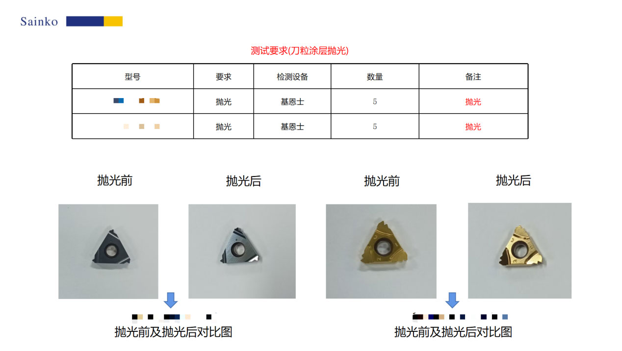 本次測(cè)試樣品為客戶提供的兩款刀粒,各5件,核心需求為涂層拋光處理。我司采用PL-12C設(shè)備及15000-L型號(hào)磨料進(jìn)行加工,實(shí)現(xiàn)了涂層表面液滴去除,有效提升了產(chǎn)品表面質(zhì)量。具體測(cè)試結(jié)果詳見(jiàn)本報(bào)告。